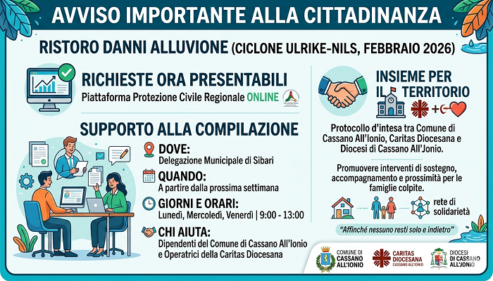 La Giunta municipale del Comune di Cassano All’Ionio ha approvato uno schema di Protocollo di Intesa tra la Diocesi di Cassano all’Jonio, la Caritas Diocesana e il Comune di Cassano all’Ionio, che sarà firmato nei prossimi giorni, ma che già rende attuativo l’istituzione di un Tavolo di Coordinamento finalizzato al sostegno delle persone e dei nuclei familiari colpiti dagli eventi alluvionali che hanno interessato la Sibaritide nel mese di febbraio scorso. A sottoscriverlo saranno il Sindaco Avv. Gianpaolo Iacobini, il Vescovo Mons. Francesco Savino e il Direttore della Caritas diocesana Don Giuseppe Cascardi, e nasce a seguito delle gravi conseguenze provocate dalle alluvioni del 13 e del 20 febbraio 2026, che hanno colpito in particolare le aree di Lattughelle e dei Laghi di Sibari, causando l’allagamento di abitazioni, attività economiche e strutture del territorio, con disagi rilevanti per centinaia di famiglie. Si stima, infatti, che siano stati coinvolti circa 700 nuclei familiari, molti dei quali si trovano ancora oggi in condizioni di vulnerabilità e necessitano di interventi di sostegno per il ripristino delle condizioni minime di vita.